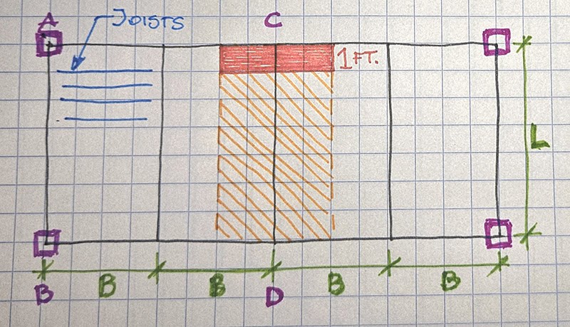 Now, what about an exterior beam like AB? Since there’s only load coming from one side, its tributary area is ½B × L.