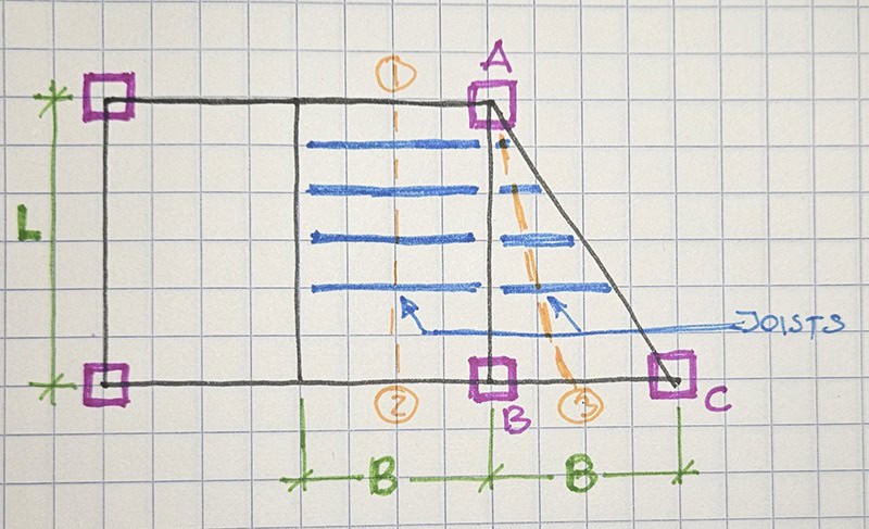 - Beam AC supports a triangular load from area A-C-3, also wBL/4. But this time, the beam is diagonal—so instead of length L, its length is L₁ = √(L² + B²). That slight geometry twist affects how we represent the load (shown in Figure 1.4).